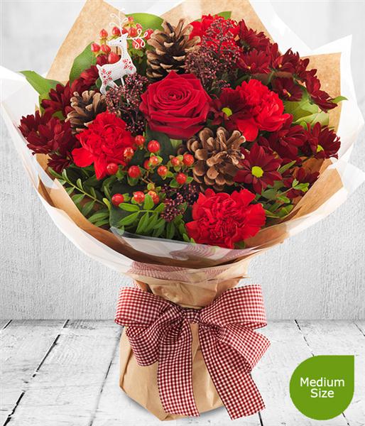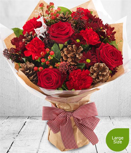 We've got Christmas all wrapped up with this pretty festive Bouquet. An array of rich red Roses, Chrysanthemums, Carnations, pine cones and berries.