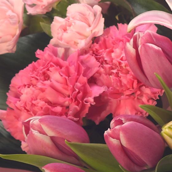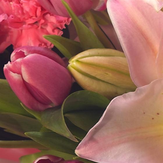 A stunning pink aqua pack flower bouquet that is sure to delight the senses. Beautifully fragrant pale pink Roses and Lilies sit perfectly with cerise Geminis and Tulips. Exquisitely gift wrapped and delivered in water for extra freshness.
