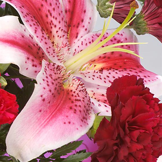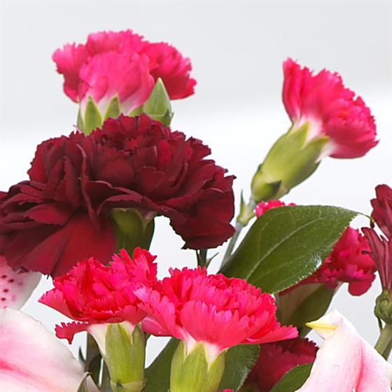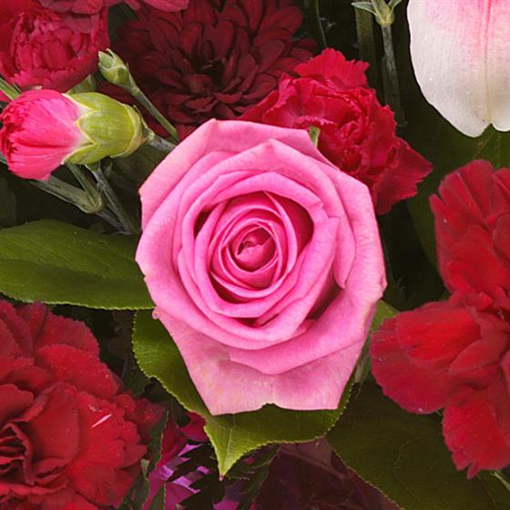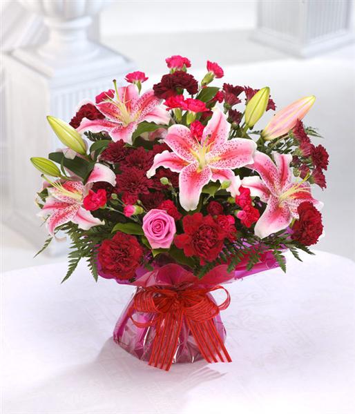 A sumptuous selection of flowers in rich reds, burgundy and pinks, featuring Lilies, Roses and Carnations, beautifully arranged for the perfect romantic gift.