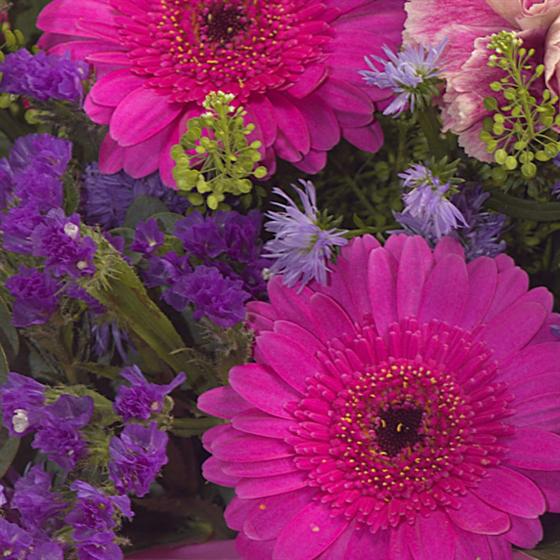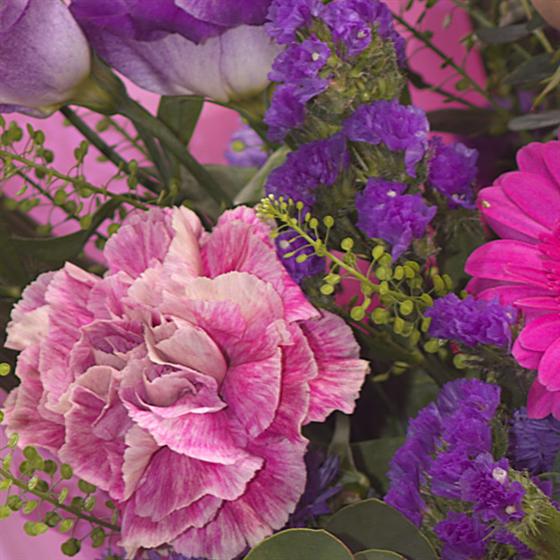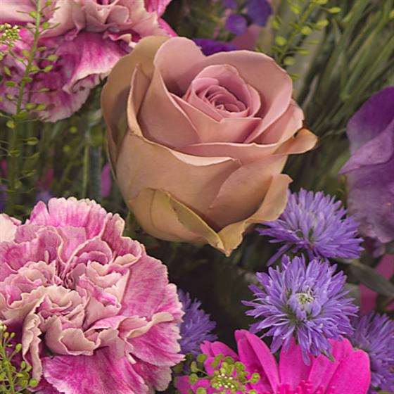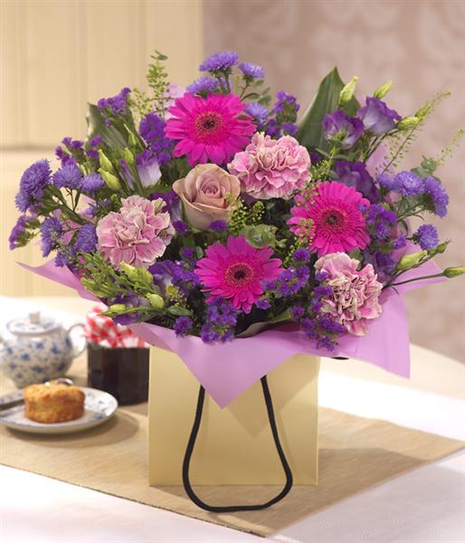 A sumptuous array of vintage Roses and Carnations, vibrant Gerbera, Lisianthus, Statice and Aster beautifully presented in a gift bag and aqua packed for freshness.