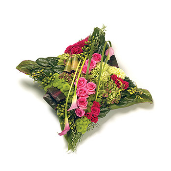 A stunning textured cushion design with an array of flowers & foliage including Roses, Hydrangea , Hypericum Calla Lilies and complementary foliage edging.