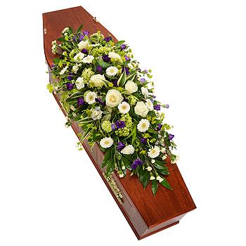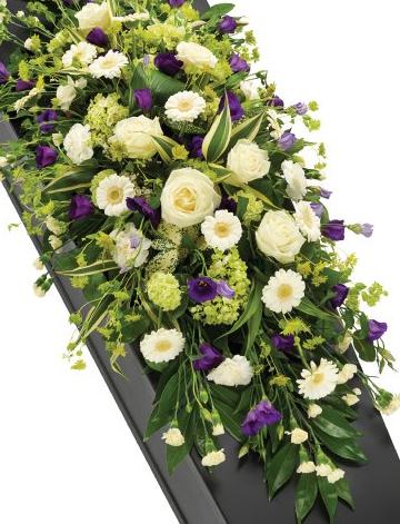 A gorgeous white casket spray interspersed with purple Lisianthus blooms. White Roses, Germini, Carnations and Viburnum are lovingly arranged with an assortment of foliage to give it that country garden feel.
